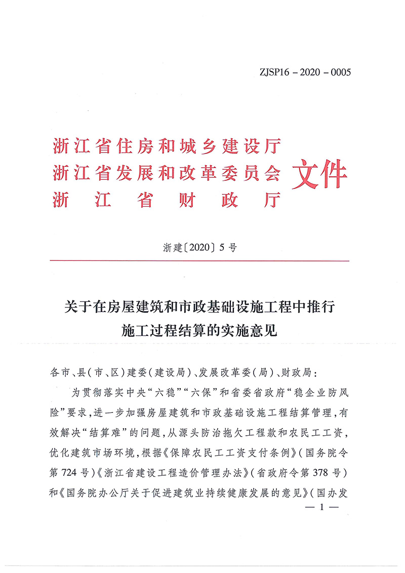 为贯彻落实中央 “ 六稳”“ 六保” 和省委省政府"稳企业防风要求,进一步加强房屋建筑和市政基础设施工程结算管理,有效解决 “结算难 " 的问题,从源头防治拖欠工程款和农民工工资,优化建筑市场环境,根据《保障农民工工资支付条例》(国务院令第724号)《浙江省建设工程造价管理办法》(省政府令第378号)和《国务院办公厅关于促进建筑业持续健康发展的意见》(国办发[2017] 19号)《浙江省人民政府办公厅关于全面治理拖欠农民工工资问题的实施意见》(浙政办发[2017]34号)等规定,现就我省房屋建筑和市政基础设施工程中全面推行施工过程结算提出如下实施意见,请认真贯彻执行。